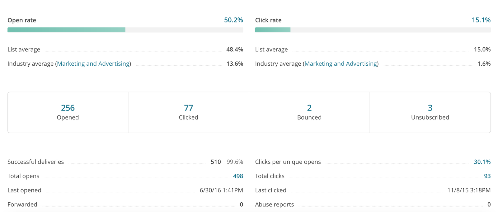 Sei in: Home1 / Pagina aziendale2 / Direct Email Marketing: chi vince la sfida tra Mailchimp, Getresponse e Active Campaign?3 / reportistica-mailchimp